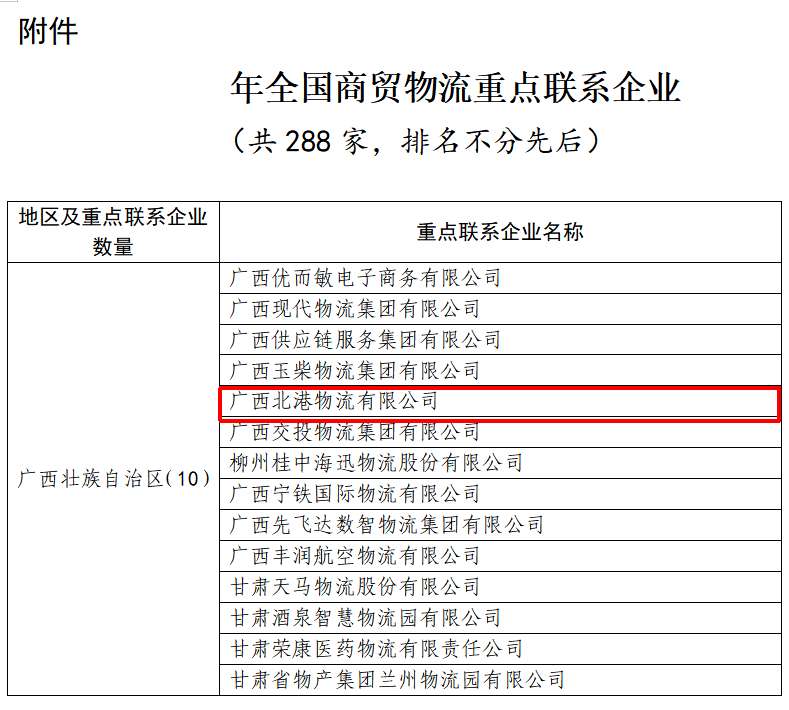 经过自治区商务厅层层遴选,北港物流凭借经营质量、业务规模等综合指标上的强劲实力,成功入选2022年全国商贸物流重点联系企业公示名单。